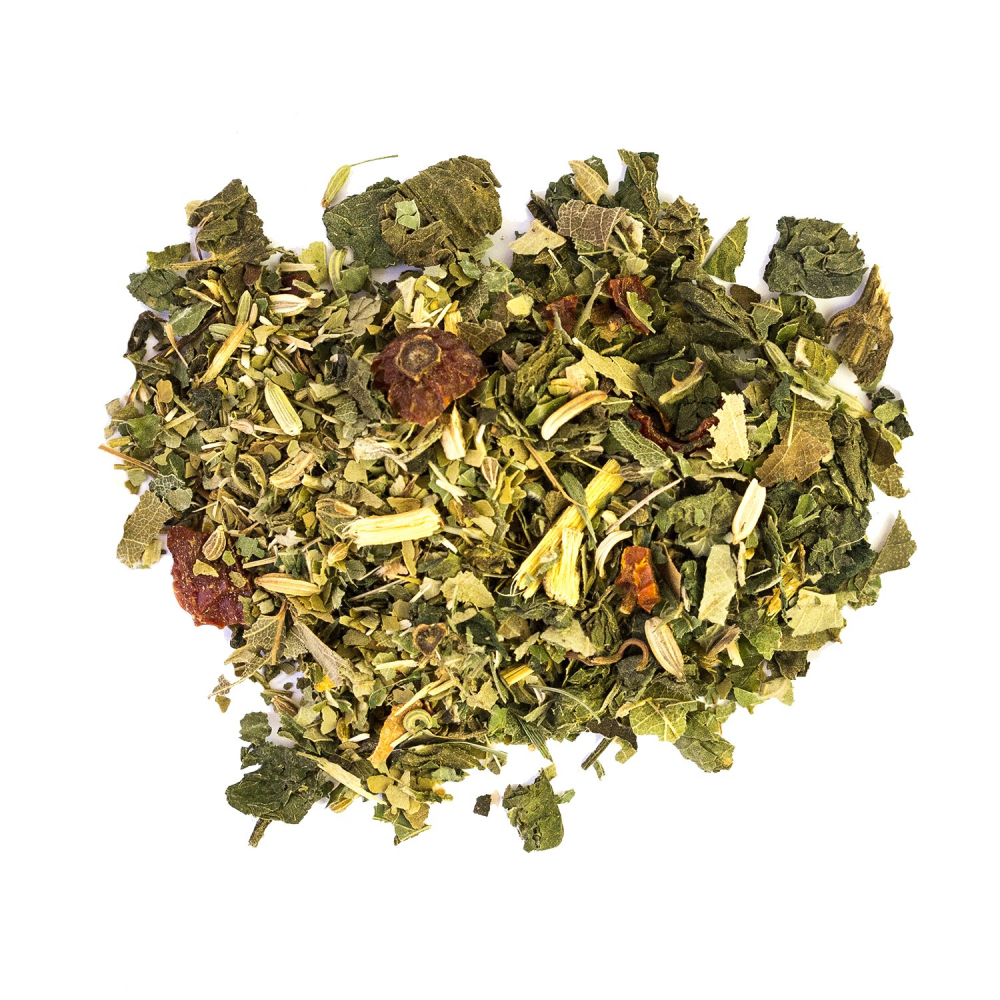 - Maté vert*, feuilles de mûre*, ortie*, cynorrhodon*, fenouil*, anis*, feuilles de bouleau*, racine de réglisse*.