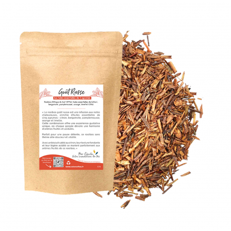 Le rooibos goût russe est une infusion aux notes chaleureuses, enrichie d’huiles essentielles de cinq agrumes : citron, bergamote, pamplemousse, orange et limette. Cette combinaison offre une expérience gustative unique, où chaque gorgée dévoile une harmonie d’arômes fruités et acidulés. Parfait pour une pause détente, ce rooibos sans théine allie douceur et vitalité.