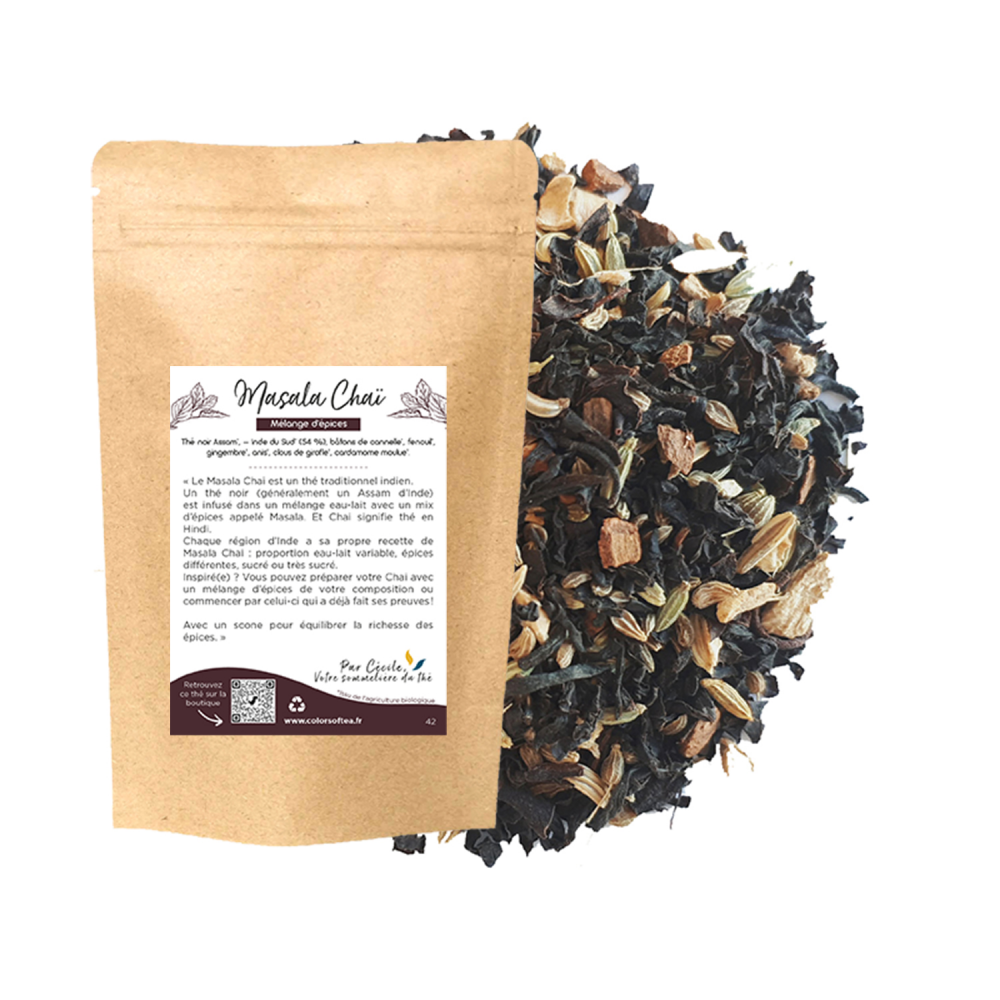 Le Masala Chai est un thé Assam mélangé à diverses épices, quotidiennement consommé en Inde où on le laisse généralement infuser avec du lait.