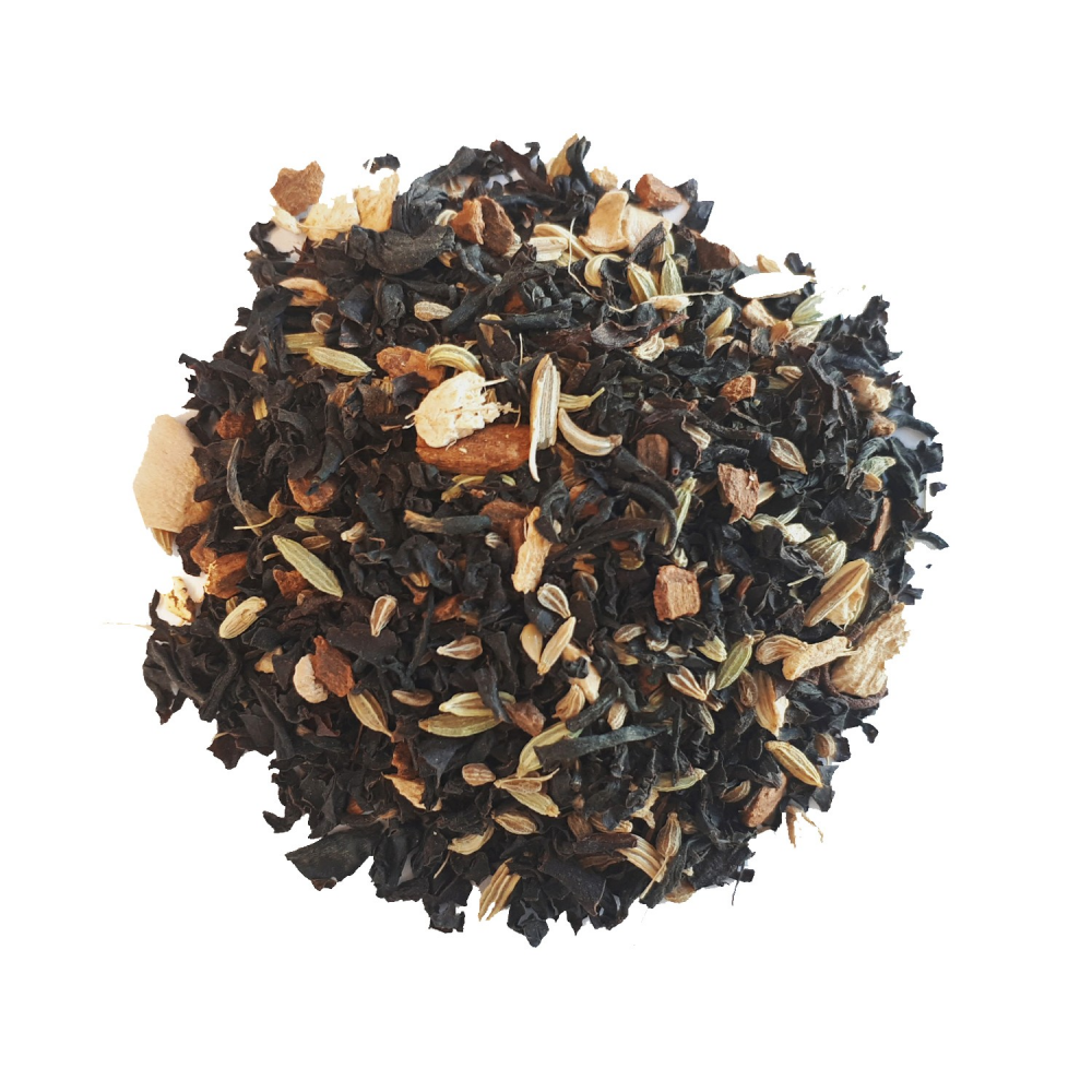 - Thé noir Assam*, -Inde du Sud* (54%), bâtons de cannelle*, fenouil*, gingembre*, anis*, clous de girofle*, cardamome moulue*.