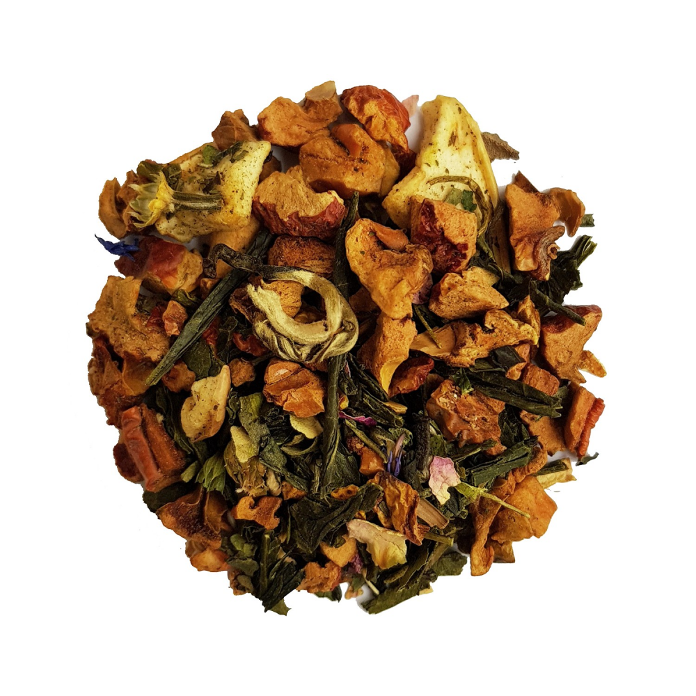 - Pomme*, thé vert de Chine Sencha*, thé vert China Jasmine*, basilic*, écorces de citron*, mélisse*, arôme naturel, China Jasmine Dragon Pearls*, pétales de rose*, fleurs de bleuet*, thé blanc Mao Feng*.