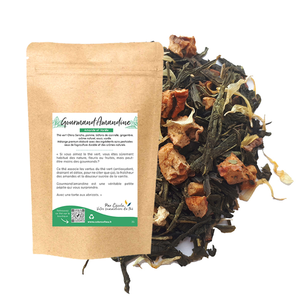 Gourmand'amandine associe les vertus du thé vert (antioxydant, drainant et détox...), la fraîcheur des amandes et la douceur sucrée de la vanille.