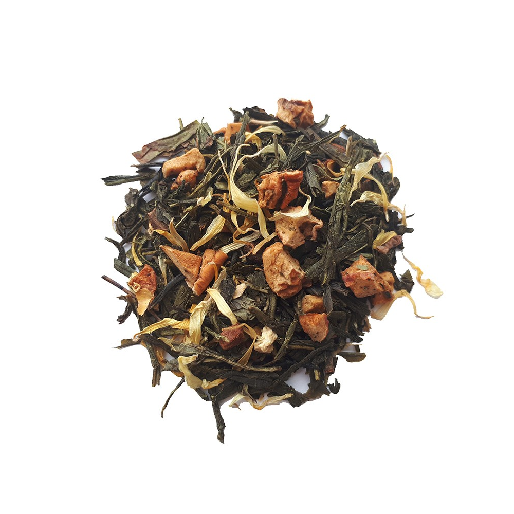 Thé vert China Sencha, pomme, bâtons de cannelle, gingembre, arôme naturel, souci, vanille. Mélange premium élaboré avec des ingrédients sans pesticides issus de l'agriculture durable et des arômes naturels.
