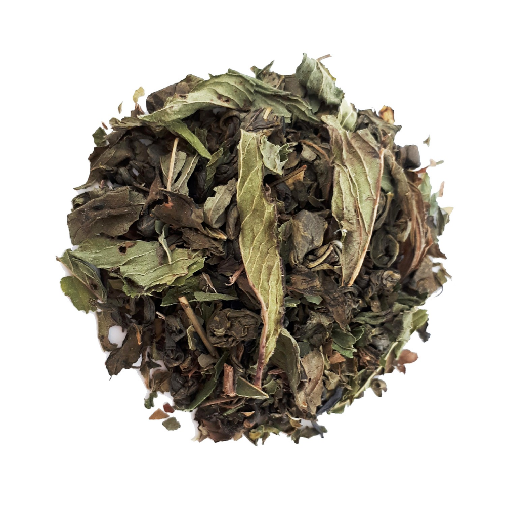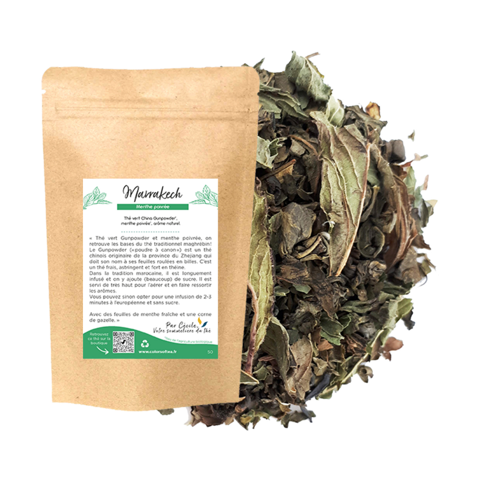 Thé vert Gunpowder et menthe poivrée, on retrouve les bases du thé traditionnel maghrébin ! Le Gunpowder («poudre à canon») est un thé chinois originaire de la province du Zhejiang qui doit son nom à ses feuilles roulées en billes. C'est un thé frais, astringent et fort en théine.