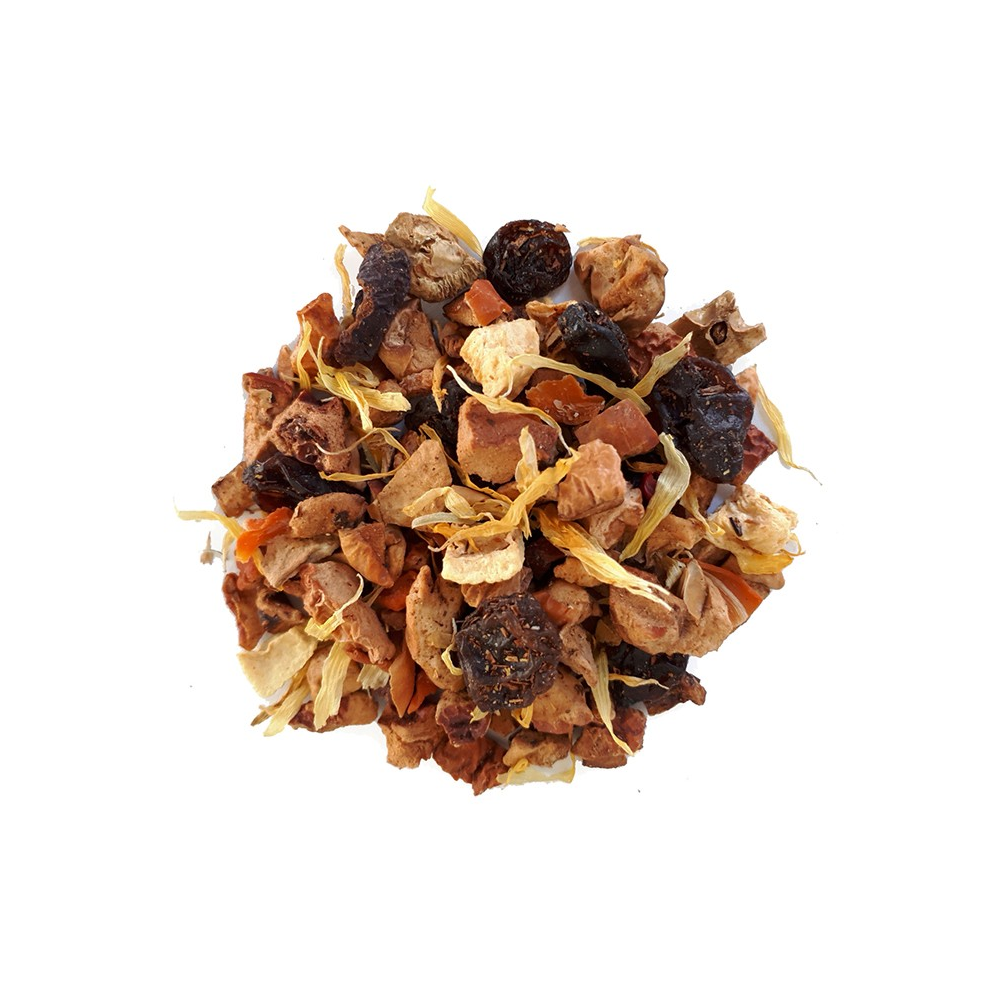 Le rooibos est agrémenté de fruits récoltés au début de l’automne : pomme, raisin et pêche de vigne.