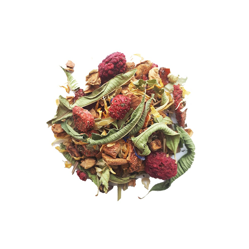 - Pomme*, cynorrhodon*, citronnelle*, menthe poivrée*, arôme naturel, souci*, verveine*, fraise*, fleurs de tilleul*, fleurs de bleuet*, aronia*, framboise*.